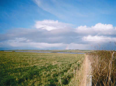 RAINBOW FADING PAINT AT TWILIGHT ON BARN SIDE There is a clarity to the light here - both geography and history can contribute to explain the physics of it, but I simply note it and try to catch it. When I first moved here from Indiana, I missed the bold colours of the autumn leaves, but the moor changes colours with the days and the seasons, but it takes a bit more care to see it. And rainbows. They often fill the sky arching overhead or as in this photo peek shyly out from between clouds. |