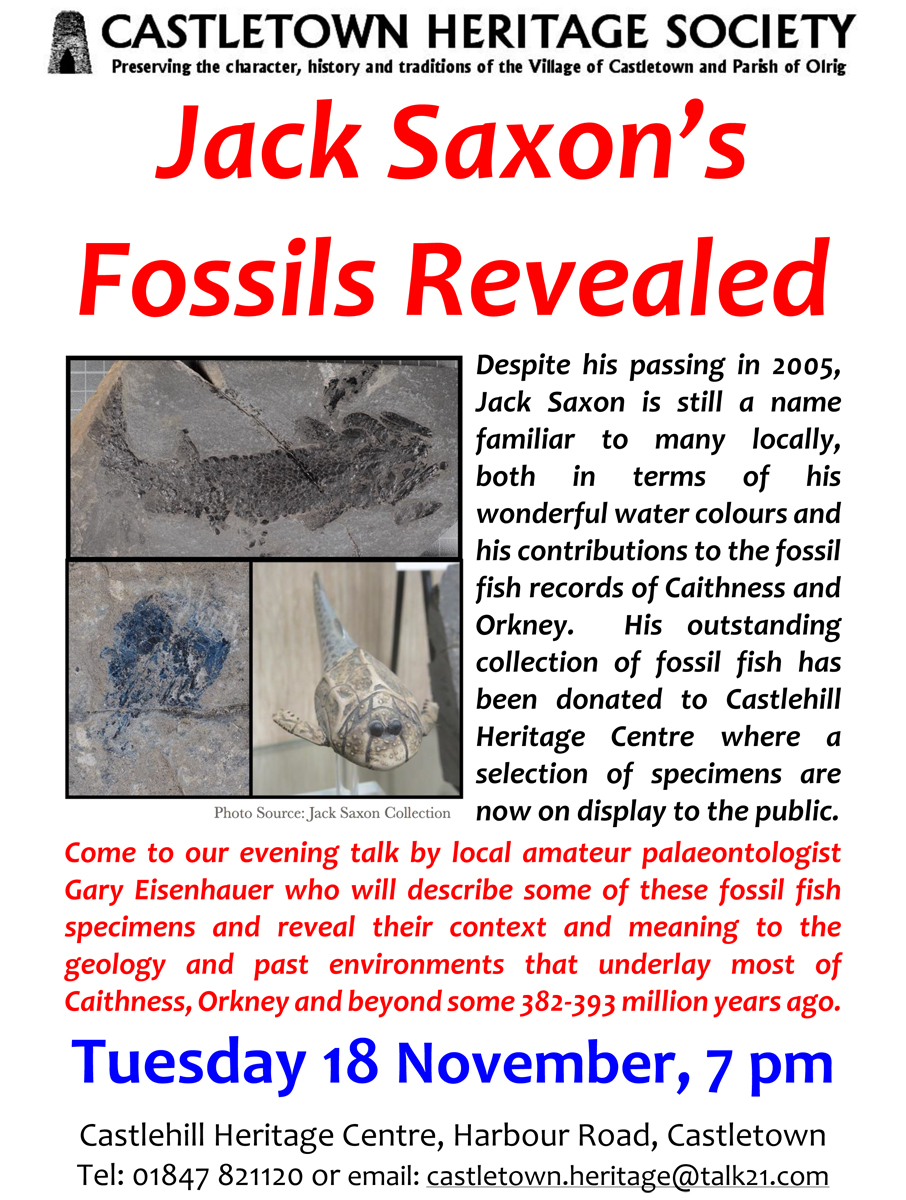 Come to our illustrated evening talk on Tuesday 18th November at 7 pm. Local amateur palaeontologist Gary Eisenhauer will describe some of these fossil fish specimens and reveal their context and meaning to the geology and past environments that underlay most of Caithness, Orkney and beyond some 382-393 million years ago. |